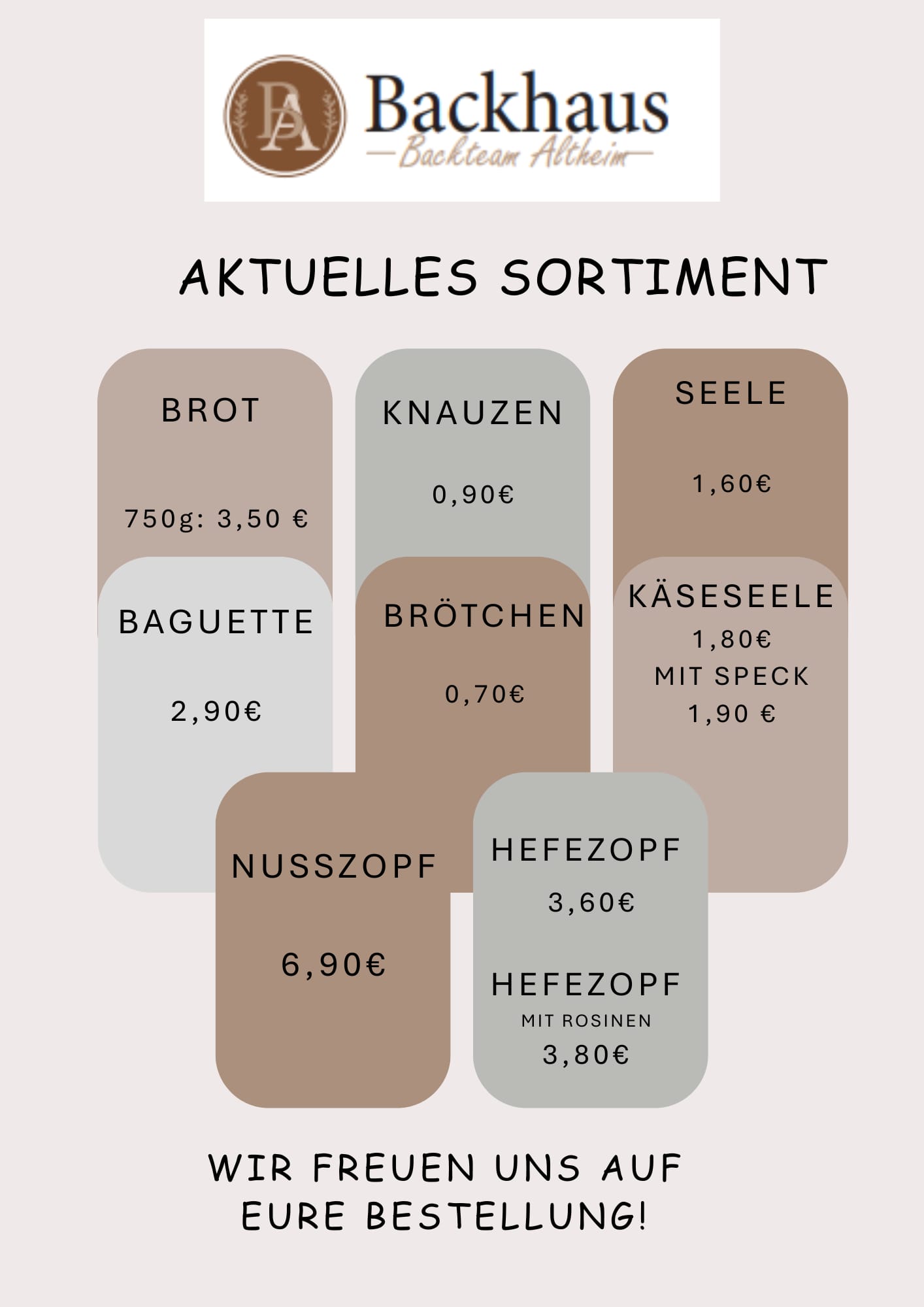 Ihre Backwarenbestellung können Sie vorab, bis 3 Tage vor dem jeweiligen Backtermin, unter 0175 64 59 812 auf den Anrufbeantworter sprechen oder über WhatsApp schicken. Gerne auch per Mail an backhaus_backteam.altheim@aol.com.